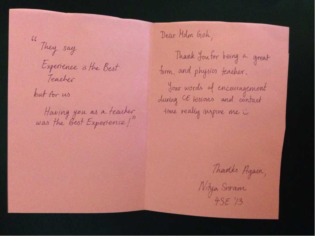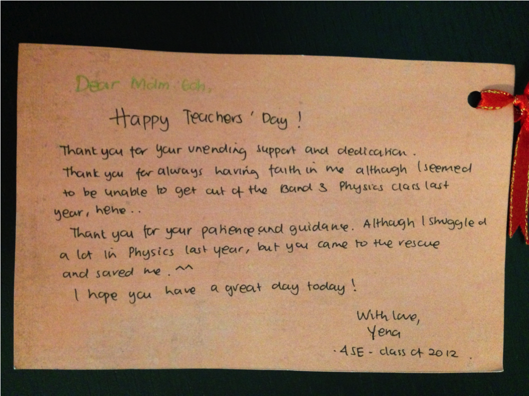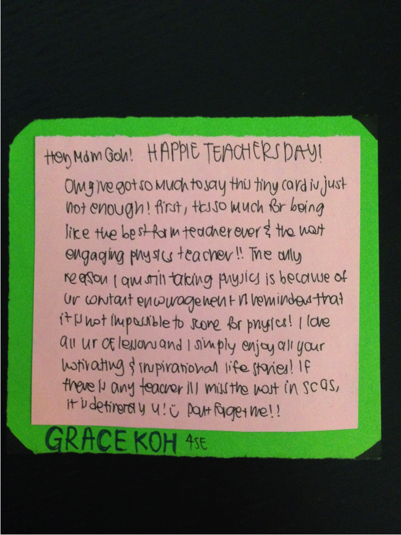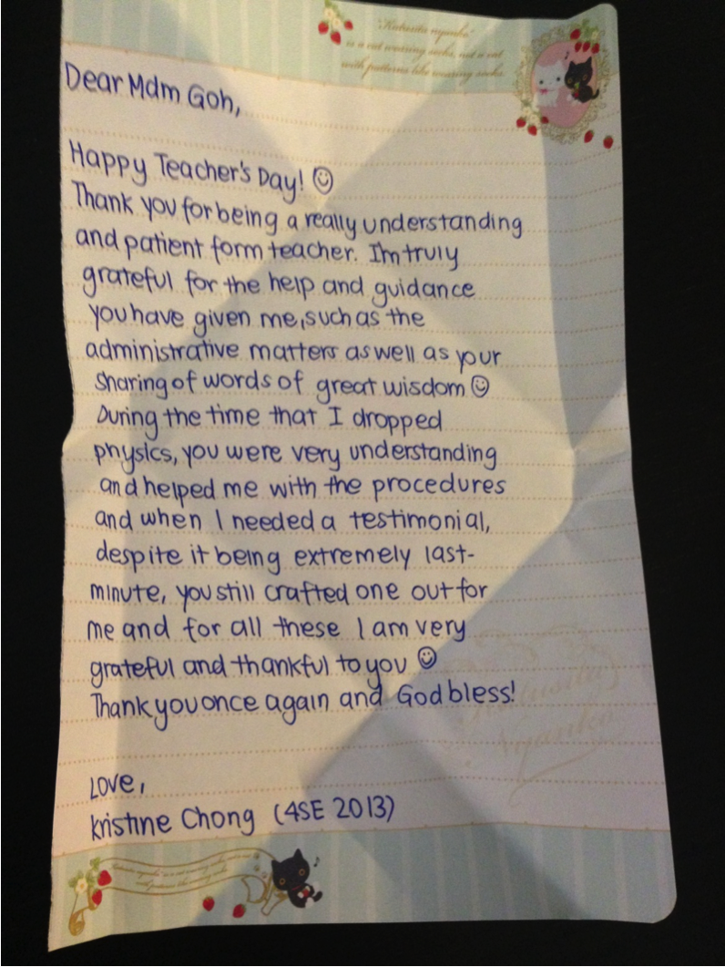 It has always been a joy for me to step in class and learn from the students as I try to impact and create their love and motivation for life and studies. As these students express their thankfulness, and there are many that are not publicized in this website, I would like to express my thankfulness to them for enriching my life. May their journey in life after secondary school days be continuously filled with zest and spontaneous laughter as they continue to soar and find their place in the society.